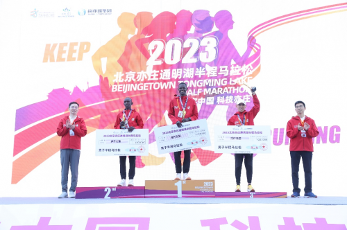 经过激烈的角逐,来自肯尼亚的SAMUEL KALALEI和NAOMIKAKOKOLIMAMUREI分别凭借1小时5分51秒和1小时15分54秒的成绩获得2023北京亦庄通明湖半程马拉松男子组和女子组冠军。左仁贵、沈金坤分别为男、女子组前三名获奖选手颁奖。